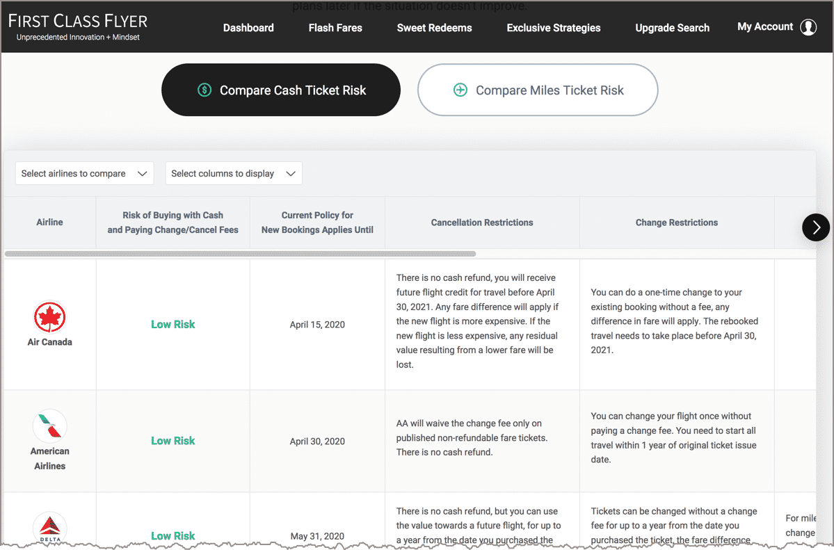 At this point you’re probably thinking: “FCF: what are the risks of booking now?!” Glad you asked. Our team has created a definitive search-and-find-by-airline widget—and by miles versus cash tickets—to inform you at a glance the risks.