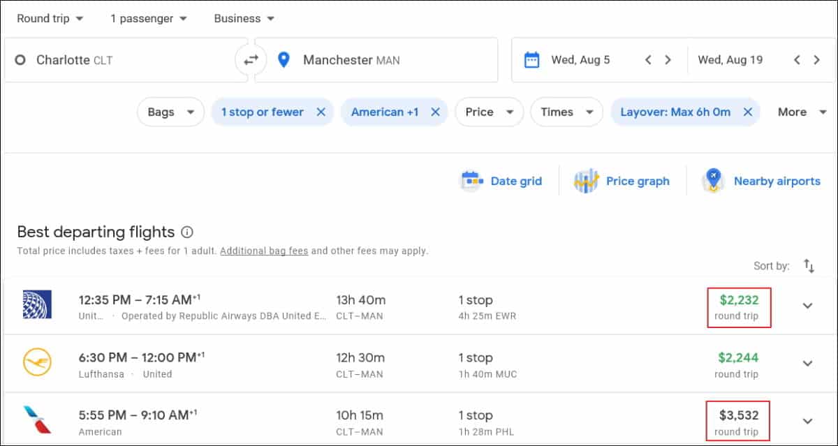 It’s not just Delta. American Airlines loyalists should look at the screenshot below (if they can stomach it) to see that a round-trip flight from its hub in Charlotte to Manchester in Business Class will cost them $1,300 more than if they flew with United. You’d think there would be no loyalty left in the world.