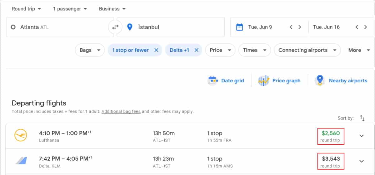 Take a look at the screenshots below and the cost of being an elite-focused traveler or tied to a single airline for whatever reason. In the first instance, a Delta flight to Glasgow out of its home hub of Atlanta costs $3,445 round-trip with one stop. British Airways is only charging $2,383. That $1,062 is a big difference that doesn’t sound like a home field advantage to me.