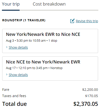 Screenshot of sample fare on united.com: